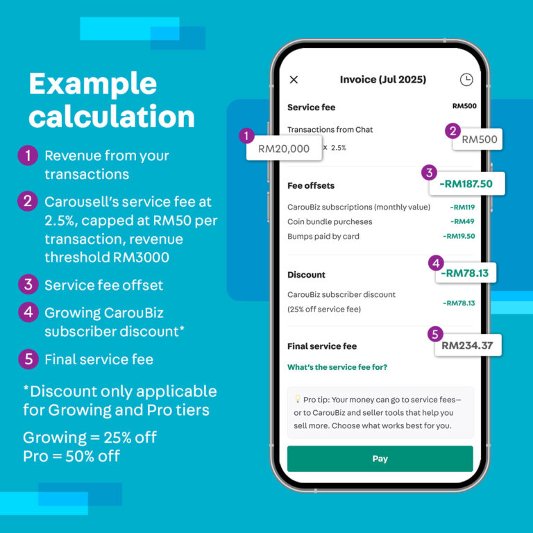 Your total service fee for the month will be offset by the amount you have spent on CarouBiz, Coins, seller tools and quotas during the same month.