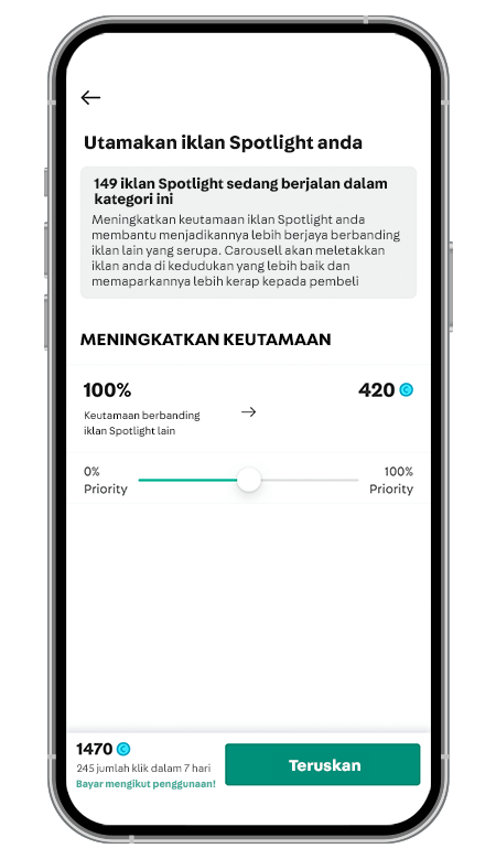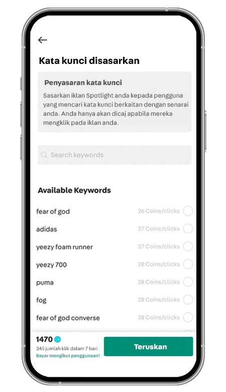 Daripada memperuntukkan sejumlah tetap Carousell Coins untuk membayar Spotlight dan menerima pulangan bagi Coins yang tidak digunakan, penjual kini hanya akan dikenakan bayaran selepas klik dihantar ke senarai mereka.