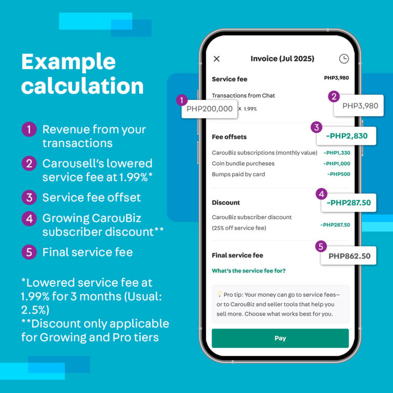 Your total service fee for the month will be offset by the amount you have spent on CarouBiz, Coins, seller tools and quotas during the same month.